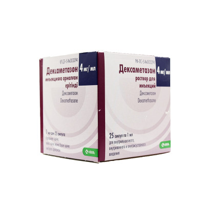 - шок различного генеза (анафилактический, посттравматический, послеопе-рационный, кардиогенный, гемотрансфузионный и др.) - отёк головного мозга (при опухолях головного мозга, черепно-мозговой травме, нейрохирургических операциях, кровоизлиянии в мозг, менингитах, энцефалитах, лучевых поражениях) - астматический статус - тяжелые аллергические реакции (отек Квинке, бронхоспазм, дерматоз, острая анафилактическая реакция на лекарственные препараты, переливание сыворотки, пирогенные реакции) - острая гемолитическая анемия - тромбоцитопения - агранулоцитоз - острая лимфобластная лейкемия - тяжелые инфекционные заболевания (в комбинации с антибиотиками) - острая недостаточность коры надпочечников - заболевания суставов (плечелопаточный периартрит, эпикондилит, бурсит, тендовагинит, остеохондроз, артриты различной этиологии, остеоартроз) - ревматоидные заболевания - коллагенозы Дексаметазон, раствор для инъекций, 4 мг/мл, используется при острых и неотложных состояниях, при которых парентеральное введение является жизненно необходимым. Препарат предназначен для кратковременного применения по жизненным показаниям.